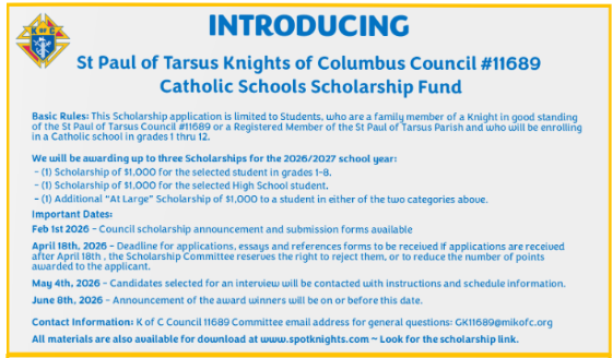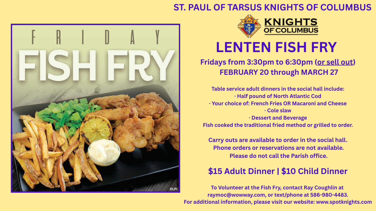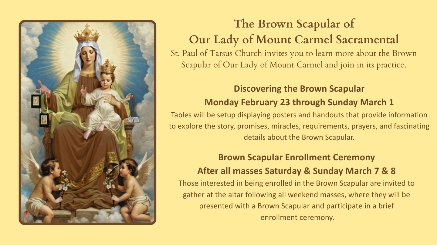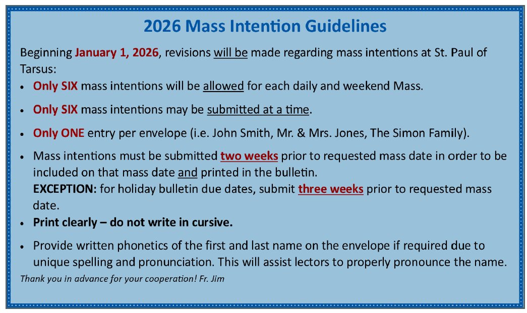 We, the Catholic family of Saint Paul of Tarsus, with the guidance of the Holy Spirit, are a visible sign of God’s Kingdom. We welcome all of God’s people and offer assistance to those in need. We will do this with open and loving hearts. Our focus is centered on Word, Eucharist, and providing hope; by living our Catholic Faith. We strive to continue the work of Jesus Christ through love, education, and evangelization.